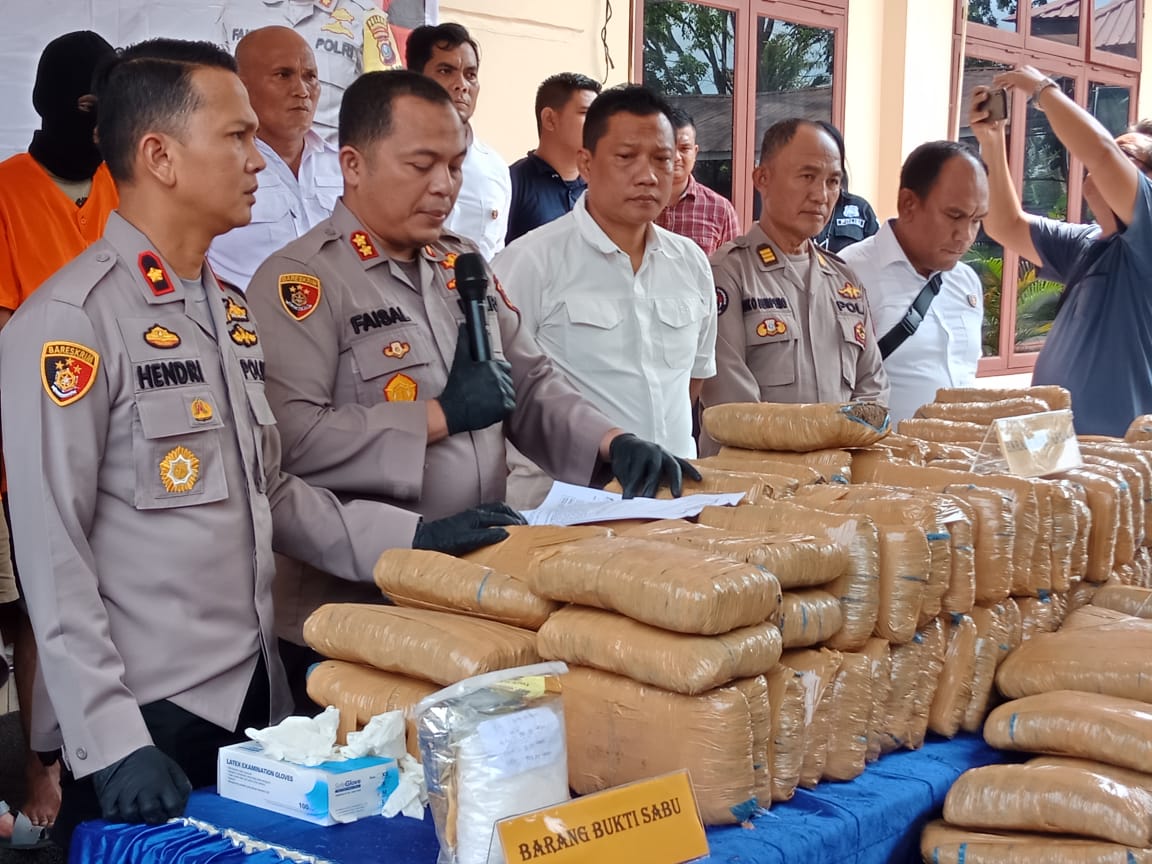 Kapolres Langkat AKBP Faisal Rahmat Husein Simatupang saat memaparkan pelaku tindak pidana narkotika.