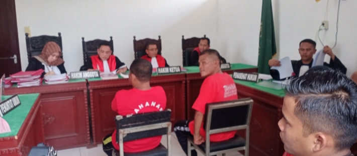 Kedua terdakwa Sumardi alias Mondo dan Selamat saat menjalani persidangan didampingi kuasa hukumnya Rudi Hasibuan SH.(dok).