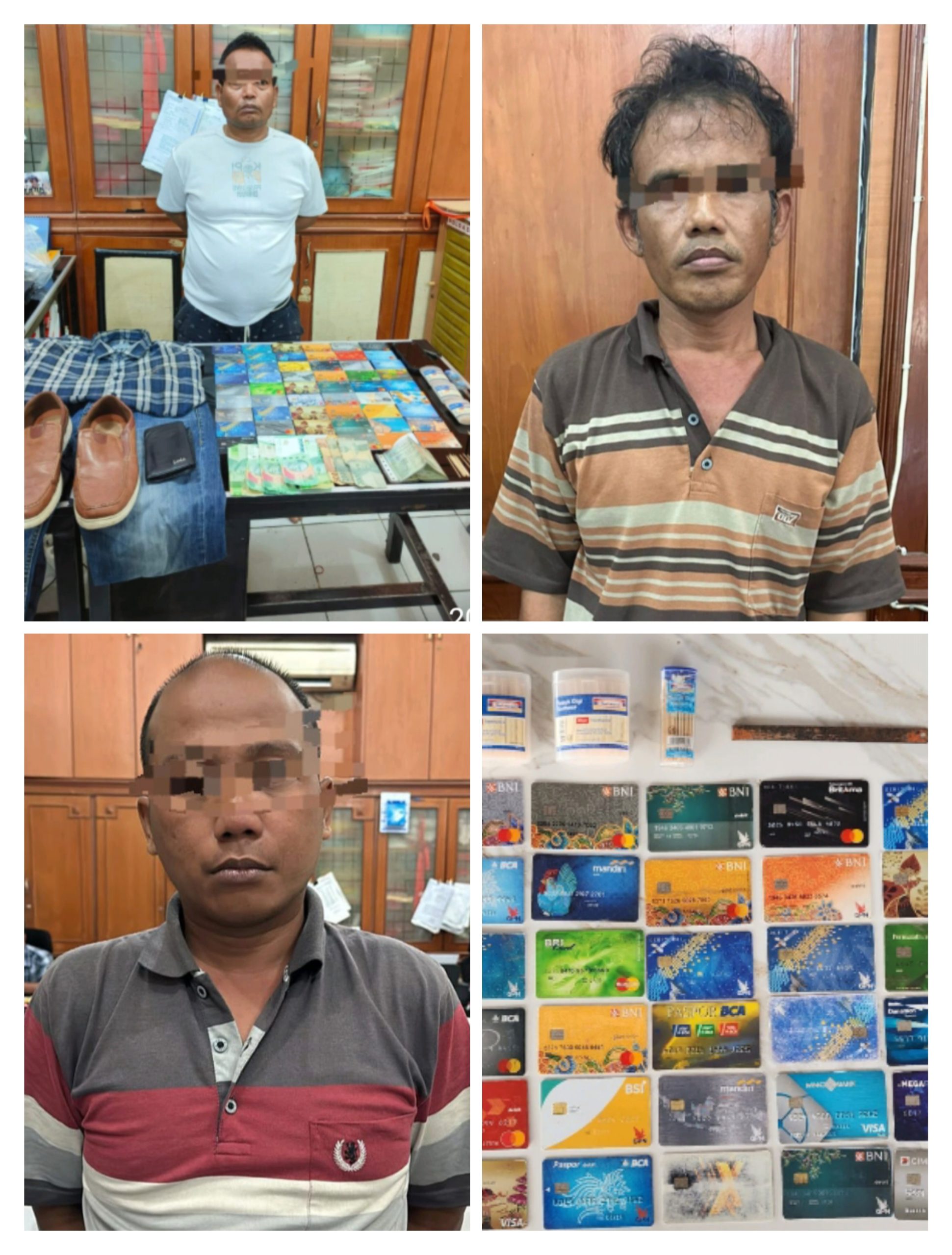 Ketiga tersangka bersama berbagai macam kartu ATM dan barang bukti hasil kejahatannya (ist).