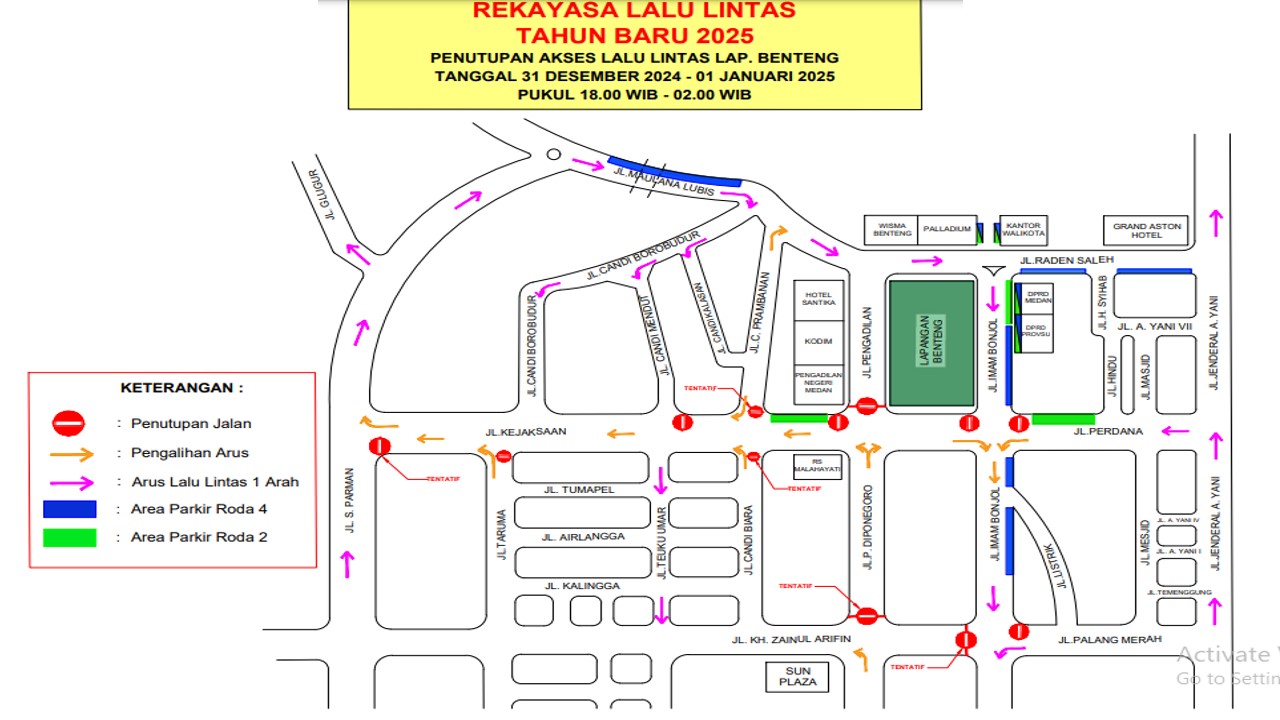 MEDAN, INVOCAVIT.COM – Satuan Lalu Lintas Polrestabes Medan memberlakukan rekayasa lalu lintas (Lalin) di kawasan Lapangan Benteng demi kelancaran lalin di malam pergantian tahun 2025.