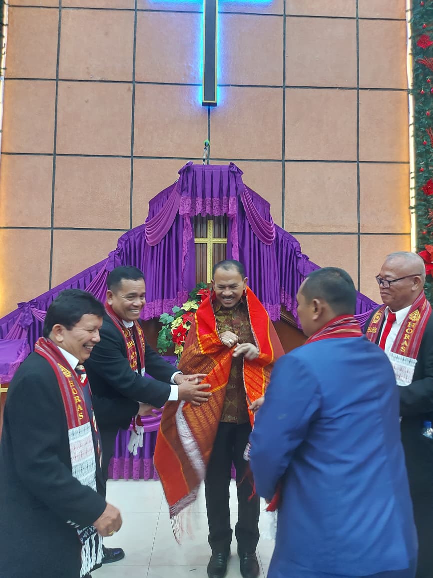 Anggota DPR RI Maruli Siahaan diulosi panitia Natal PPARB Kota Medan, Sabtu (13/12).(ist).