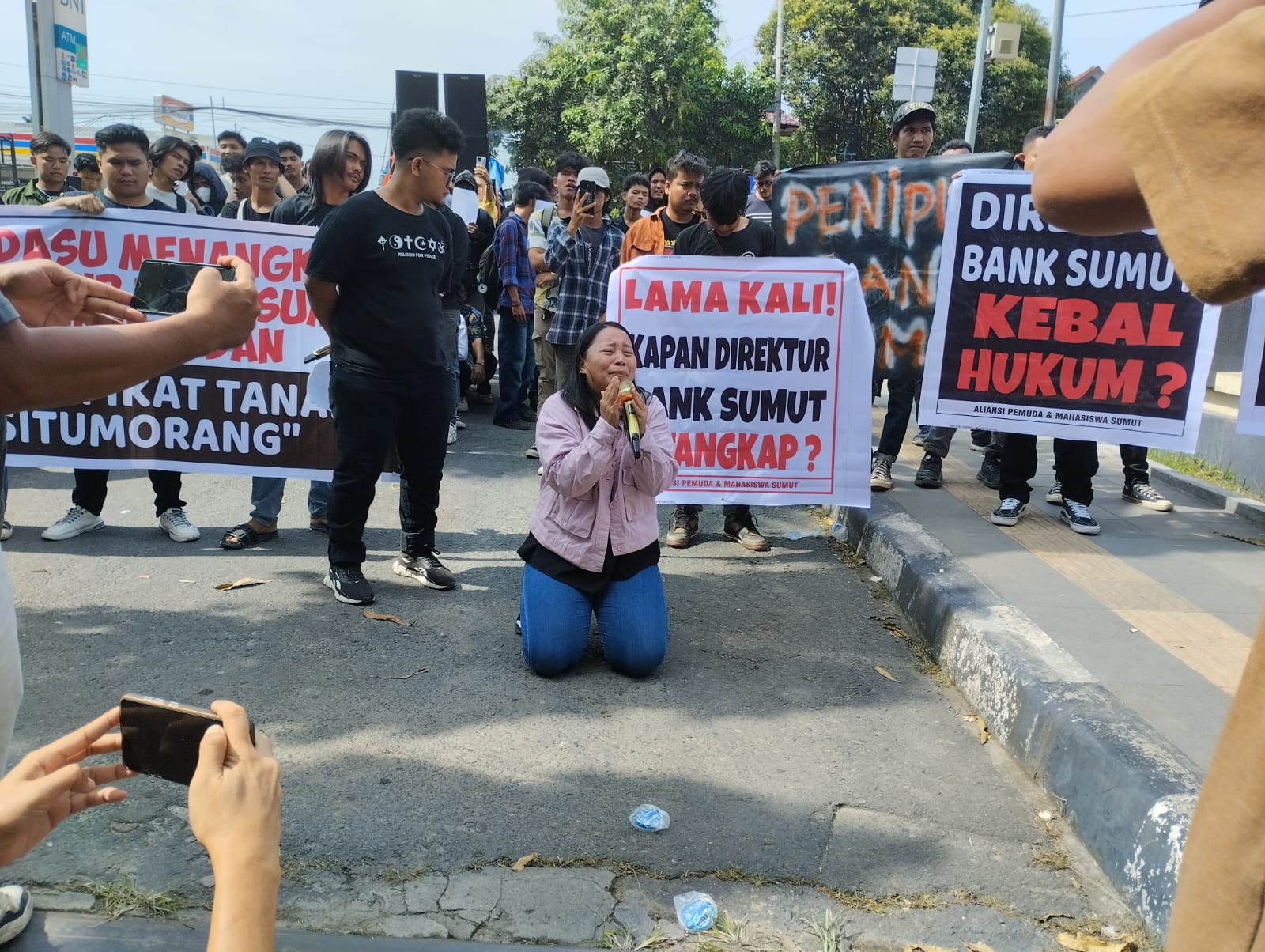 Sementara, Kuasa Hukum korban, Poltak Silitonga, SH, MH, yang hadir di tengah-tengah massa aksi menyampaikan, kejahatan yang dilakukan pejabat Bank Sumut membuat kliennya, Tianas Situmorang (67) menderita. Karena permasalahan yang dialami kliennya, Bank Sumut dilaporkan atas dugaan tindak perbankan dan dugaan penipuan.