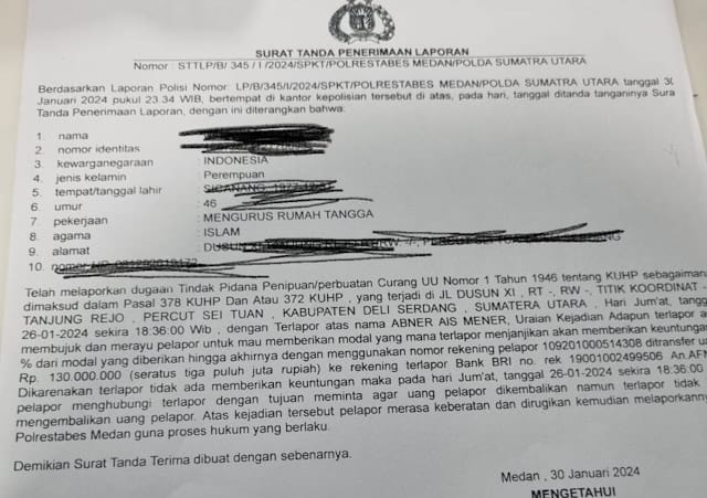 Wanita bertubuh tambun itu mengatakan telah melaporkan Afnir ke Polrestabes Medan dengan bukti laporan polisi No:LP/345/I/SPKT Polrestabes Medan/Polda Sumut tanggal 30 Januari 2024