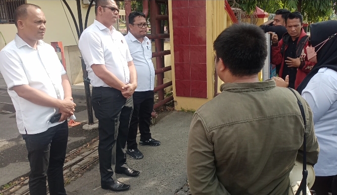 Kanit III Subdit III/Tipikor Ditreskrimsus Polda Sumut Kompol Rismanto J Purba didampingi Ipda Frisco Sinaga dan Kompol Jhon Sinaga saat memberikan penjelasan kepada para guru honor yang demo di Mapolda Sumut, Rabu (24/7/2024).(jos tambunan)