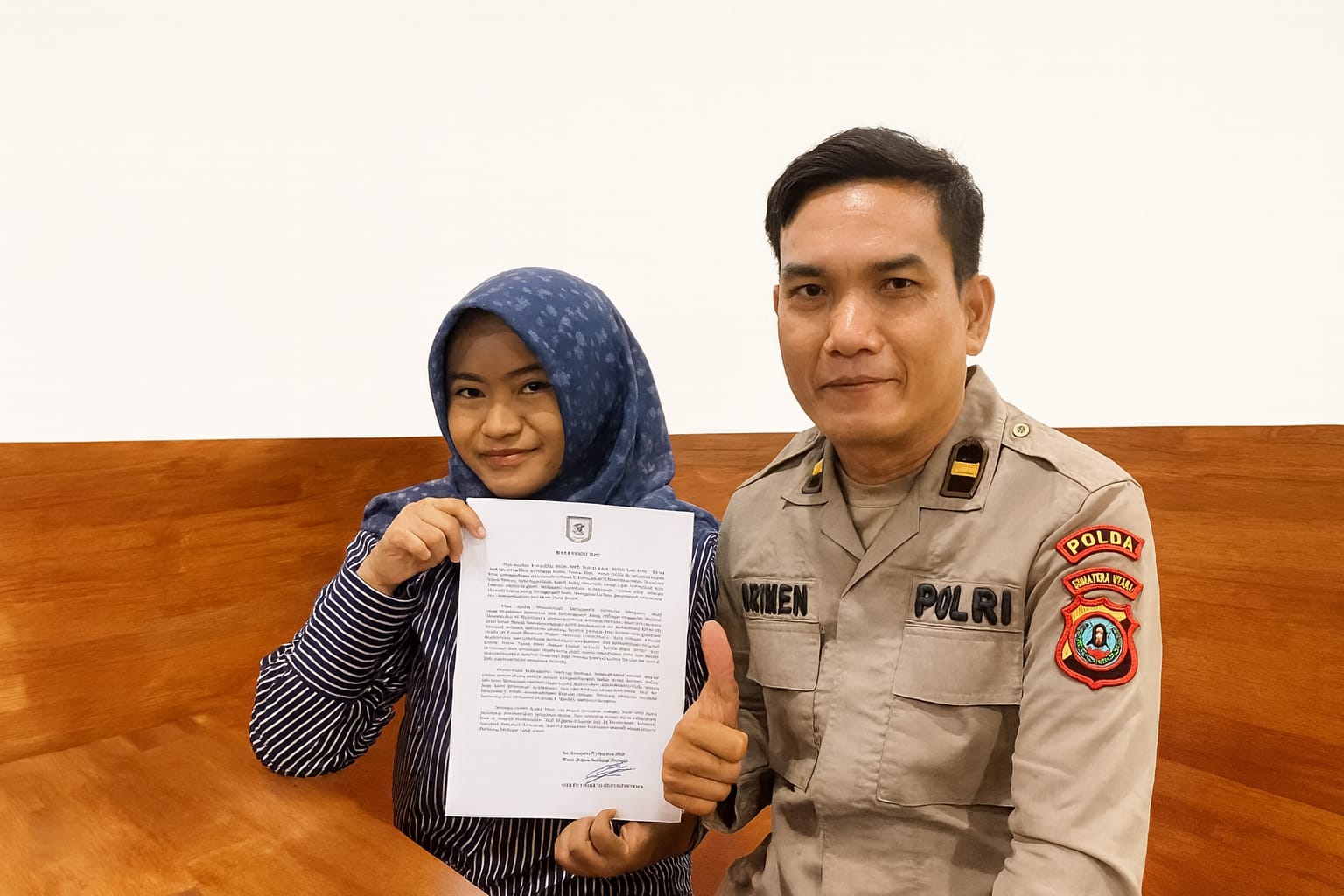 Ain, putri dari seorang wartawan, menerima salinan surat kata sambutan Bupati dan Wabup Sergai yang diserahkan oleh Ipda Brimen di Kantor Cabdisdik Sei Rampah, Sergai, Sumut, Jumat (17/10/2025).