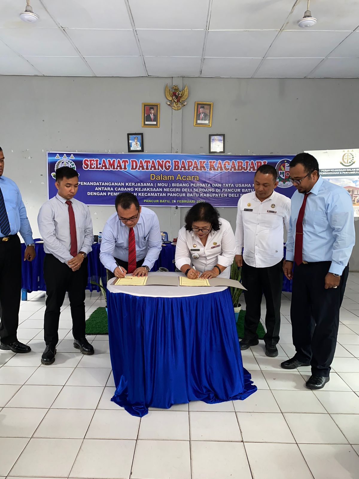 INVOCAVIT.COM, PANCURBATU – Cabang Kejaksaan Negeri (Cabjari) Deli Serdang di Pancur Batu melakukan penanda-tanganan MoU dengan pihak Kecamatan Pancur Batu dalam bidang perdata dan tata usaha negara, di aula kantor Camat Pancur Batu, Rabu (22/2).