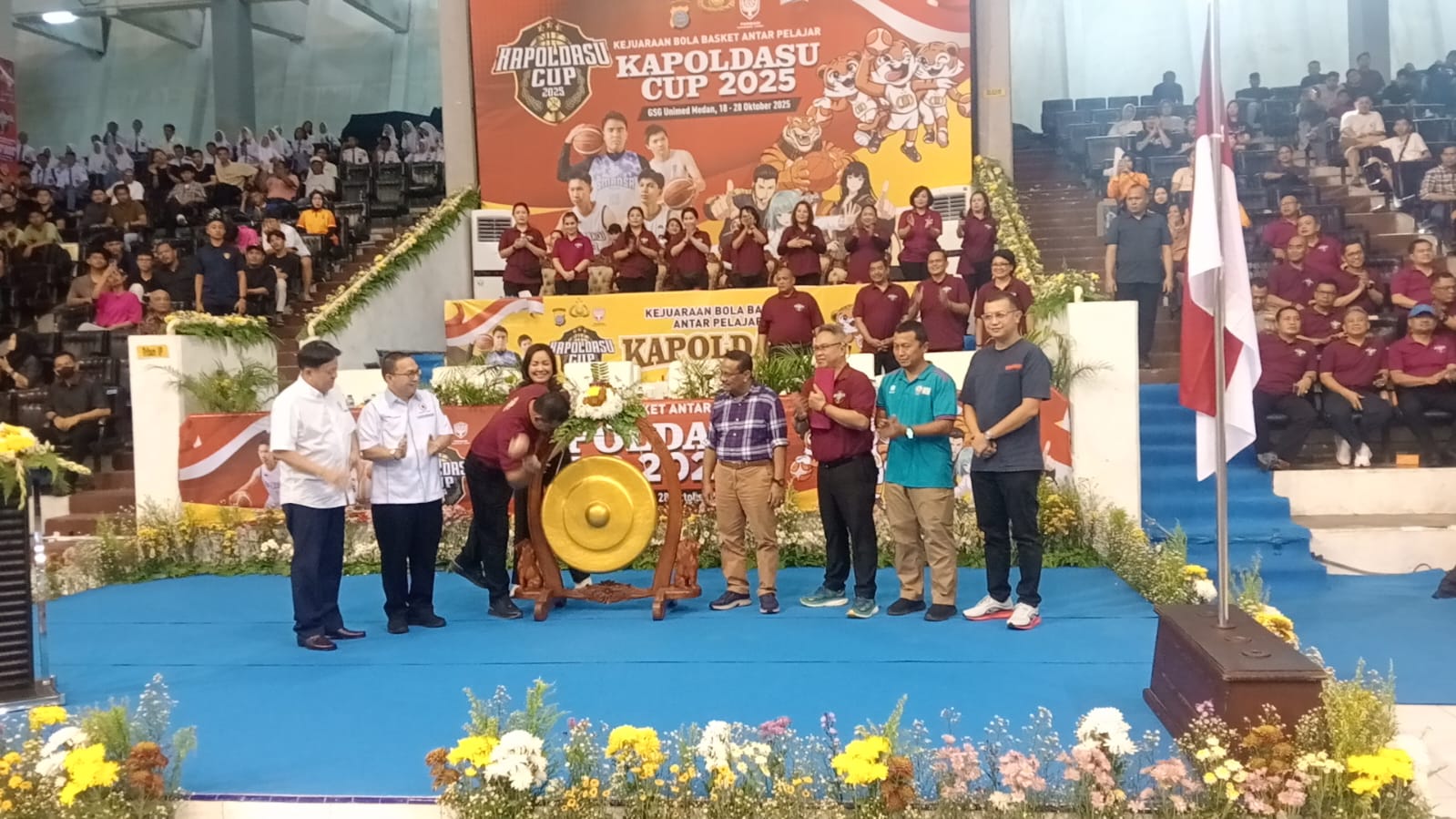 Kapolda Sumut Irjen Whisnu Hermawan Februanto didampingi Ketua Bhayangkari Sumut Ny. Mona Whisnu dan ketua panitia memukul gong tanda diresmikannya kejuaraan Bola Basket Antar Pelajar Kapoldasu Cup 2025, Sabtu (18/10) di Gedung Serba Guna UNIMED.(foto. Jos Tambunan)