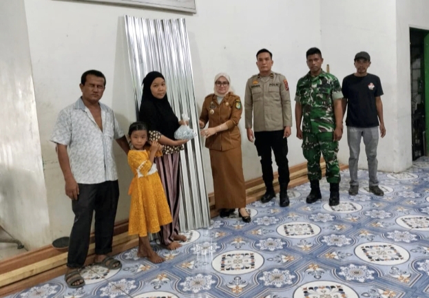 Camat Tanjung Beringin, Nurchinta Depi Tambunan, menyerahkan langsung bantuan didampingi Wakapolsek Ipda Brimen Sihotang, Serda Peris Panggabean dari Koramil serta Kades Nagur, Ruslan Buyung.