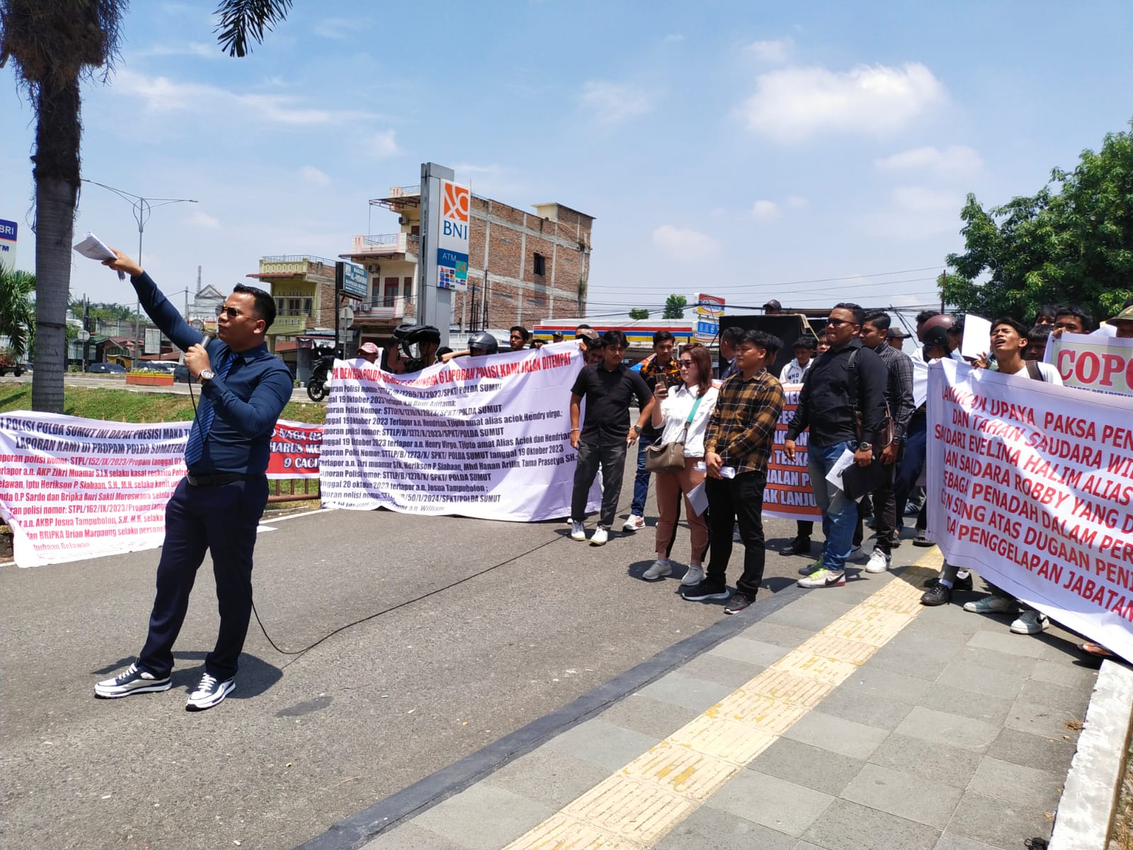 Dr (C) Tommy Aditia Sinulingga SH MH CTL, berorasi di Mapolda Sumut menuntut keadilan kliennya, Rabu (6/3/2024).(ist)