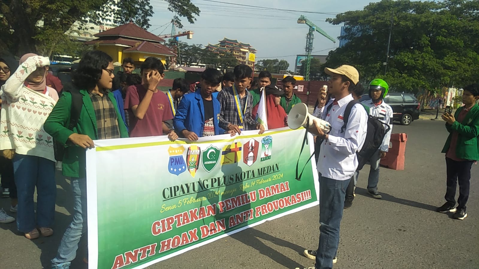 Dalam orasinya para mahasiswa mengajak seluruh elemen masyarakat untuk menciptakan Pemilu 2024 di Kota Medan berjalan damai, aman dan nyaman.