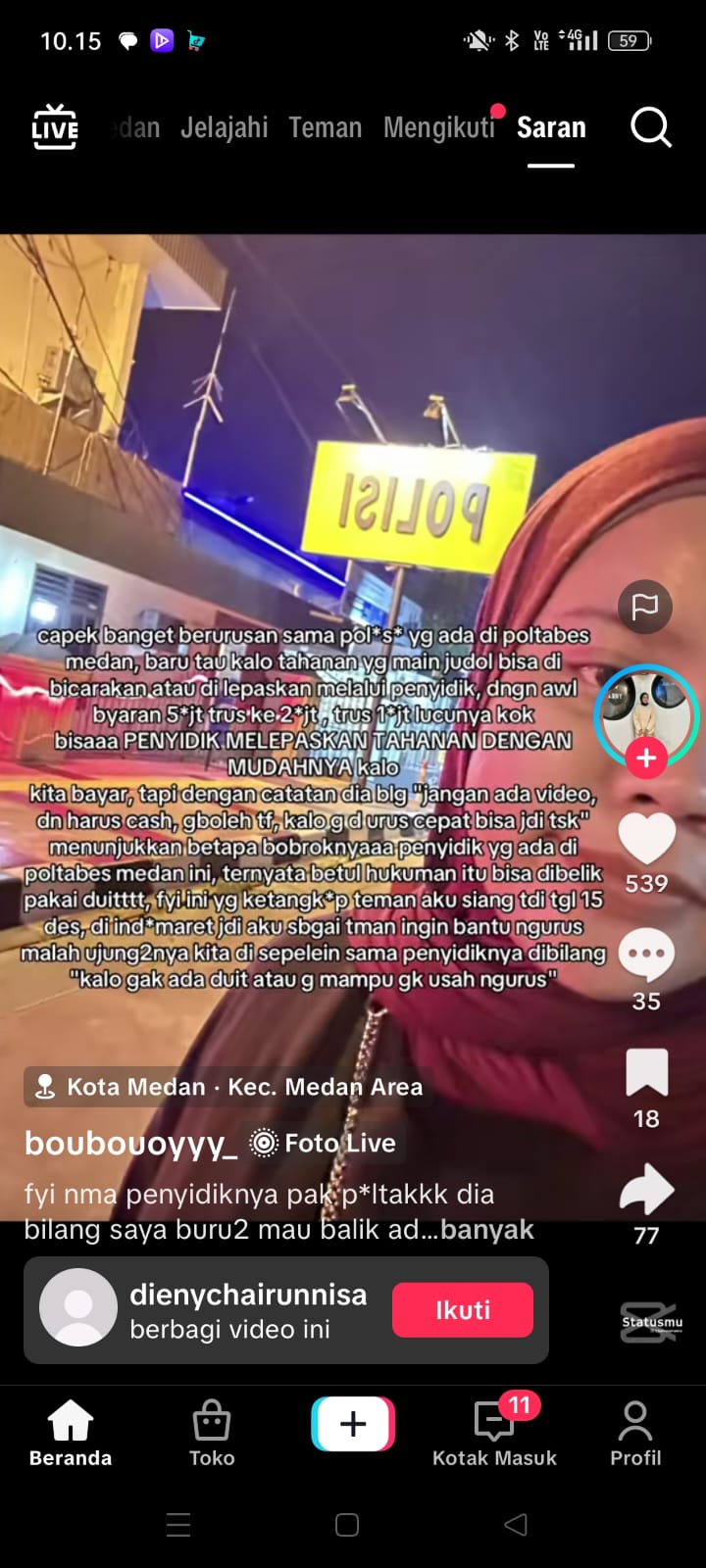 Dari penelusuran akun Tiktok Boubouoyyy, Selasa (16/12), wanita yang mengenakan hijab itu curhat awalnya datang ke Sat Reskrim Polrestabes Medan untuk melihat (menjenguk) rekannya karena ditangkap dalam kasus judi online (Judol).