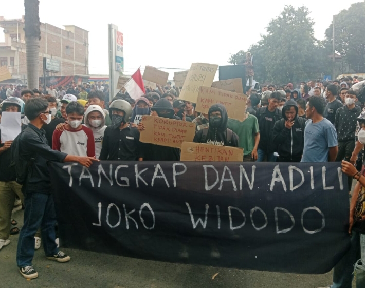 “Tangkap dan adili Joko Widodo,” teriak massa sembari membawa spanduk hitam berisikan tangkap dan adili Joko Widodo.