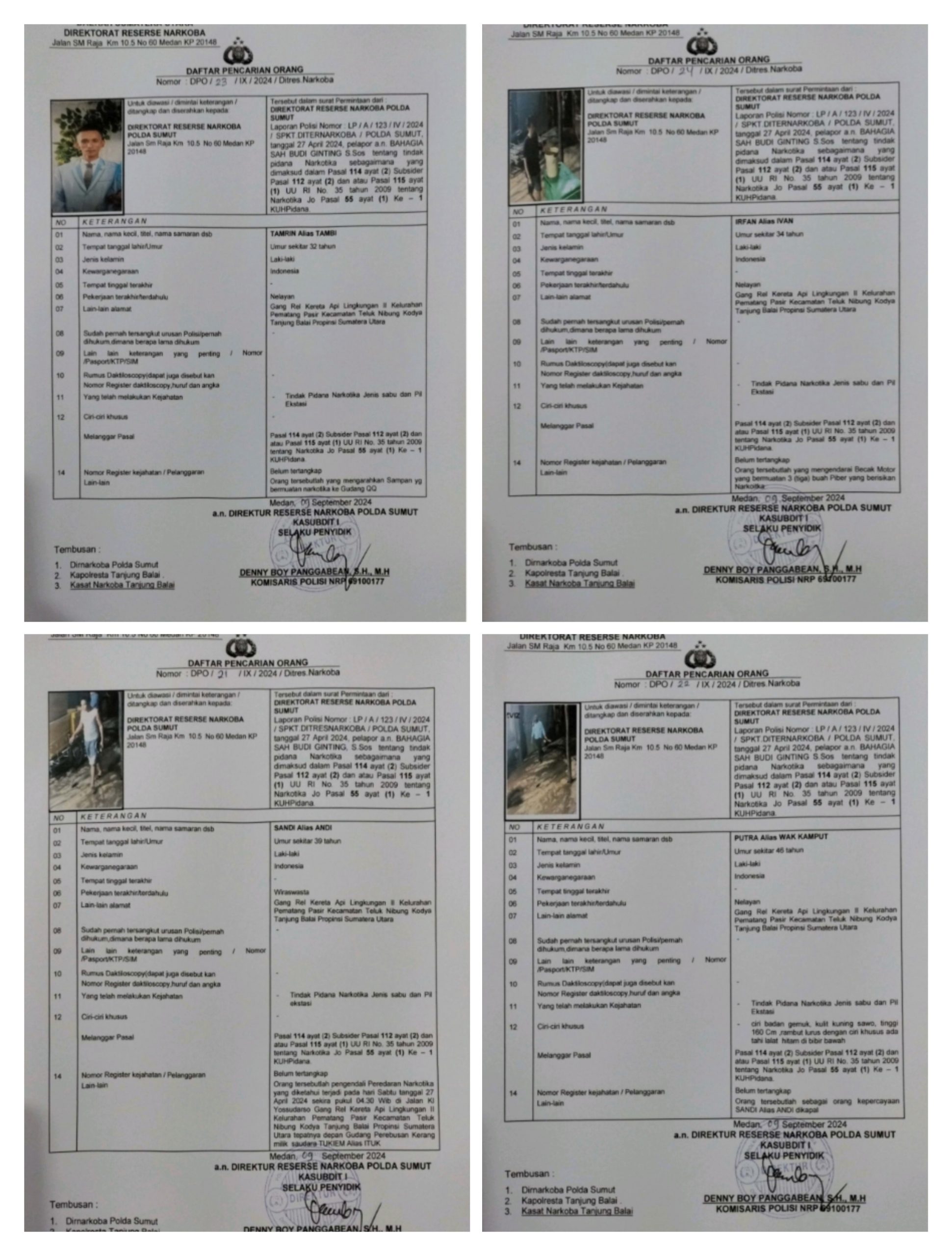 Kemudian, Thamrin alias Tamin (32) warga Kota Tanjungbalai dan Irvan alias Ivan (32) warga Kota Tanjungbalai. Untuk keempat warga Kota Tanjungbalai yang ditetapkan sebagai buronan setelah surat Daftar Pencarian Orang (DPO) itu ditandatangani Kompol Deny Boy Panggabean pada Tahun 2024 lalu.