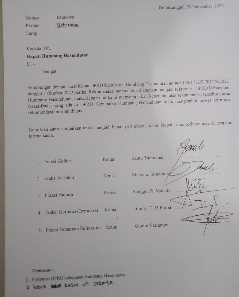 Surat keberatan itu terungkap melalui 5 Fraksi DPRD Kabupaten Humbang Hasundutan, ditujukan kepada Bupati yang ditandatangani masing-masing Ketua Fraksi tanggal 29 November 2022 ditembusan ke KASN.