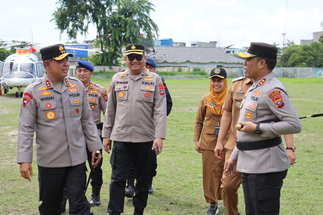 Kapolda Sumatera Utara Irjen.Pol.Whisnu Hermawan Februanto S.K. M.H, disambut Kapolres Asahan AKBP Welman Feri dan unsur Forkopimda setelah mendarat di lapangan Asahan Sakti, Senin (25/8).(anja).