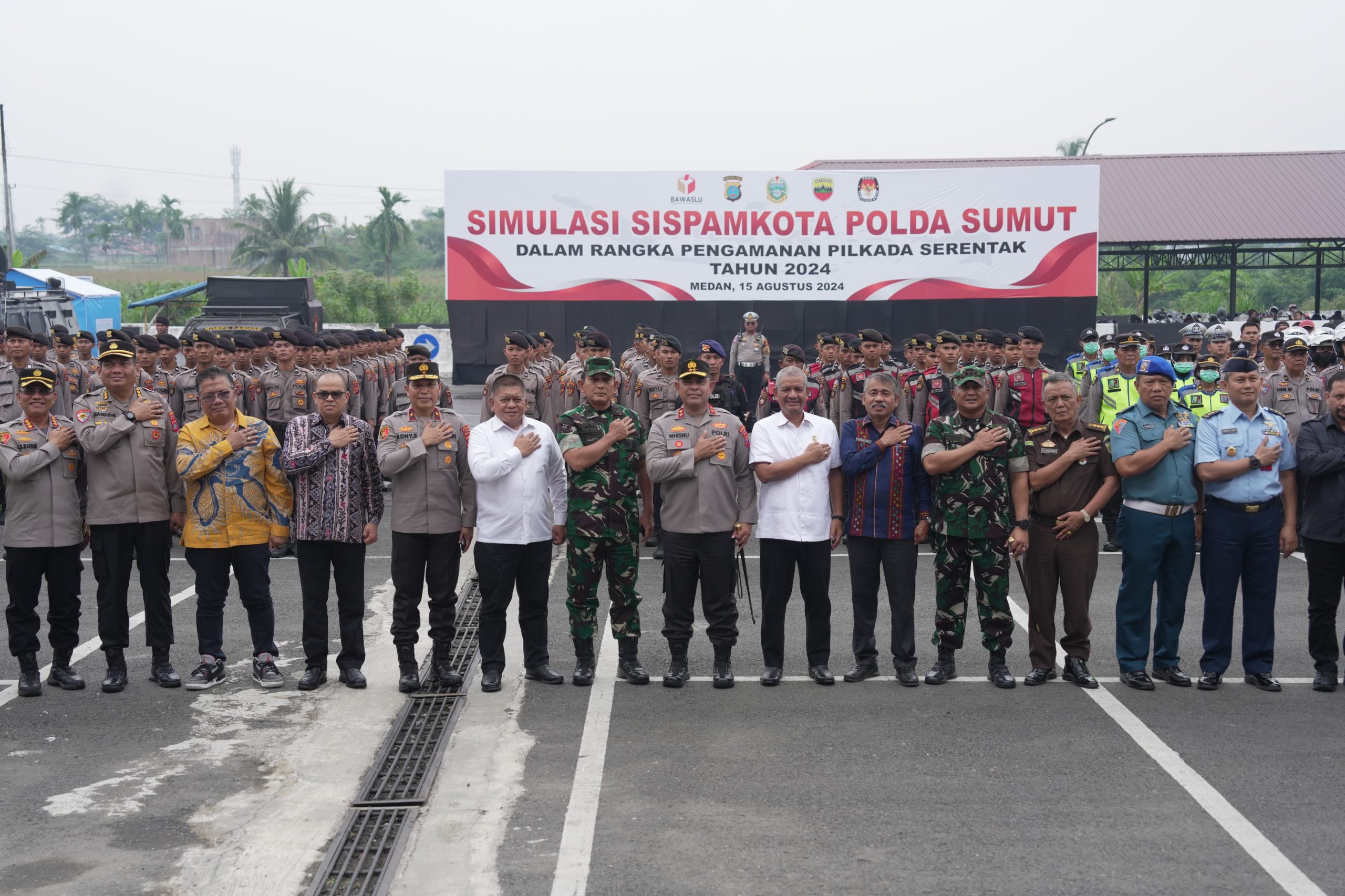 MEDAN, INVOCAVIT.COM – Polda Sumut menggelar Simulasi Sistem Pengamanan Kota (Sispamkota) sebagai persiapan menjelang Pilkada serentak 2024. Simulasi ini dilaksanakan di Halaman Parkir Mapolda Sumut dan dihadiri oleh unsur Forkopimda Sumatera Utara, Kamis (15/08/2024).