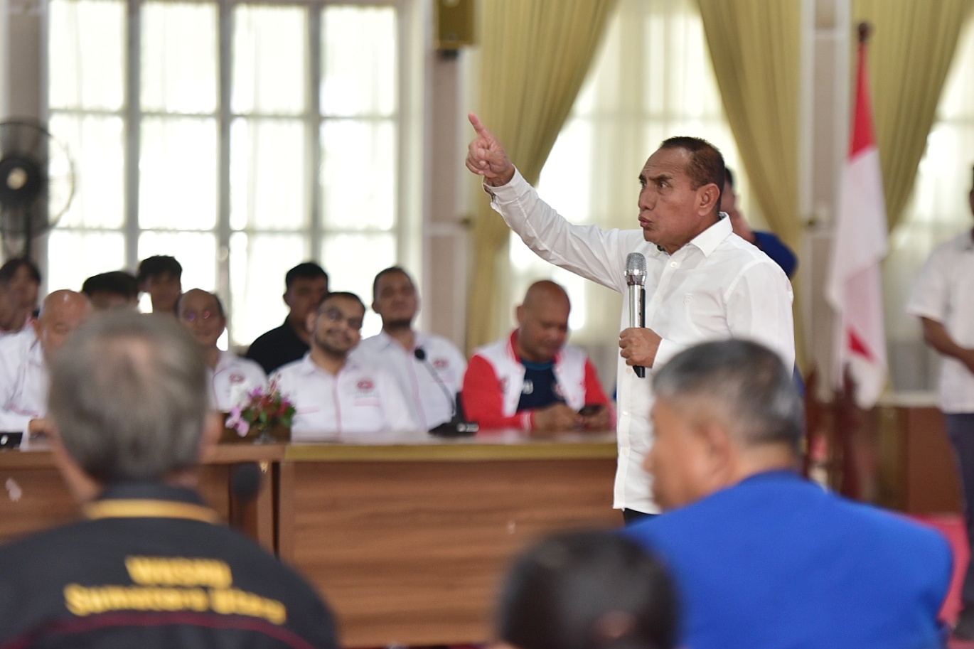 INVOCAVIT.COM, MEDAN – Gubernur Sumatera Utara (Sumut) Edy Rahmayadi meminta para atlet, pelatih dan pemusatan latihan daerah (Pelatda) cabang olahraga (Cabor) Tinju, Judo dan Wushu, berkosentrasi pada persiapan pertandingan perhelatan Pekan Olahraga Nasional (PON) XXI/2024 Aceh-Sumut.