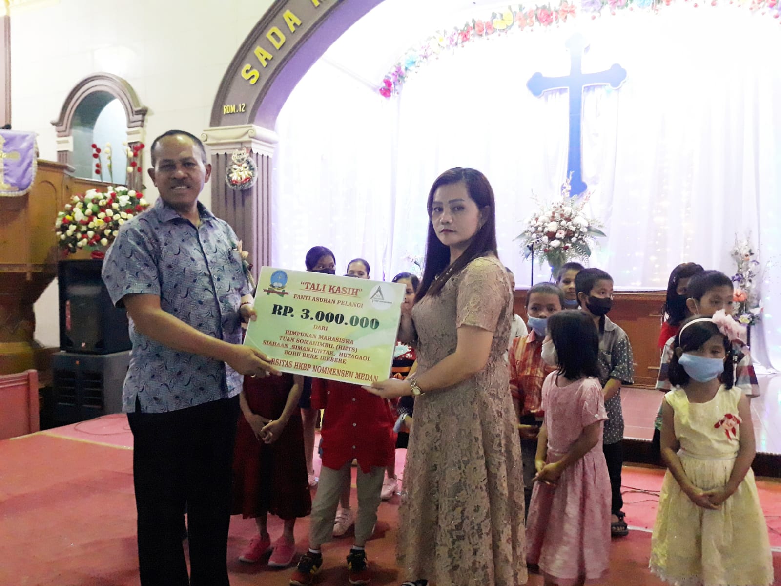 Perayaan Natal yang dipimpin Pdt Lukman Lumbantobing S.Th sekaligus pemberi khotbah diawali dengan ibadah kemudian dilanjutkan dengan pemberian tali kasih oleh penasehat HMTS Nommensen Kombes Pol (Purn) Dr Maruli Siahaan SH.MH kepada Panti Asuhan Tunas Kasih Olayama Raya dan Panti Asuhan Pelangi.
