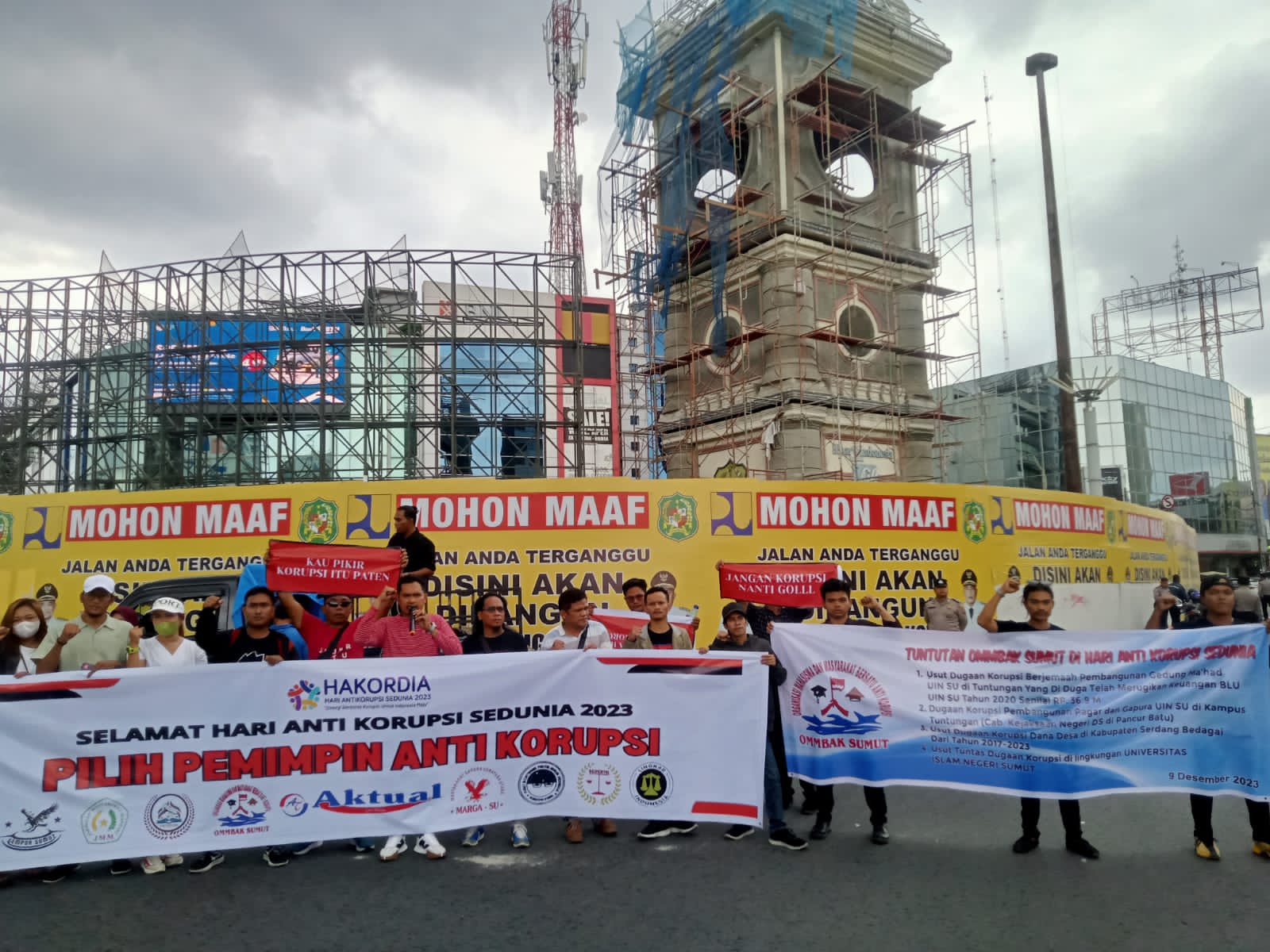 MEDAN, INVOCAVIT.COM – Belasan massa dari 9 lembaga masyarakat anti korupsi memperingati Hari Anti Korupsi Sedunia (Hakordia) 2023 di depan gedung Podomoro dan Bundaran Air Mancur Jalan Gatot Subroto, Medan, Sabtu 9 Desember 2023. Massa mengusu tema “Pilih Pemimpin Anti Korupsi” menjelang Pemilu 2024.