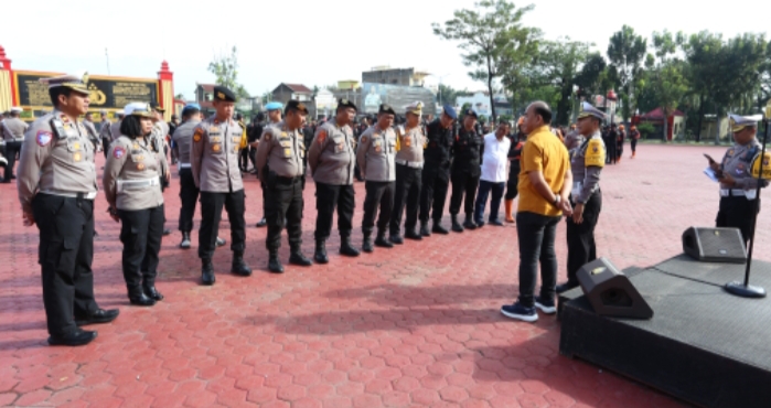 Dirlantas Poldasu Kombes Pol Muji Ediyanto memberikan perintah kepada anggotanya pada hari pertama operasi Lilin Toba 2024.(ist).
