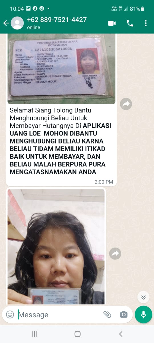 Wanita yang tinggal di Jl Gandi No 127, Kel Sei Rengas II, Kec Medan Area ini diduga menjual nama orang lain untuk memeroleh Pinjaman Online dari aplikasi “Pinjaman Lancar”.
