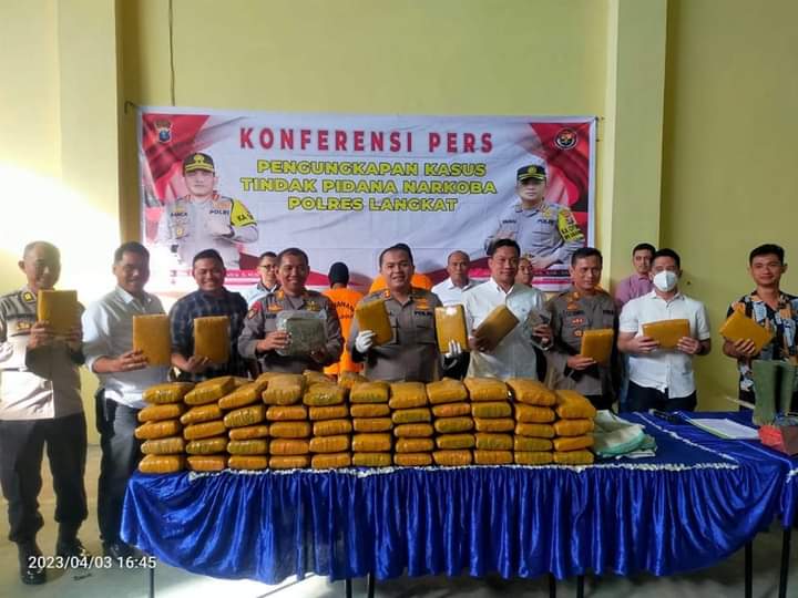 Kapolres Langkat AKBP Faisal Rahmad Husein Simatupang memperlihatkan barang bukti ganja saat konprensi pers.(ist)