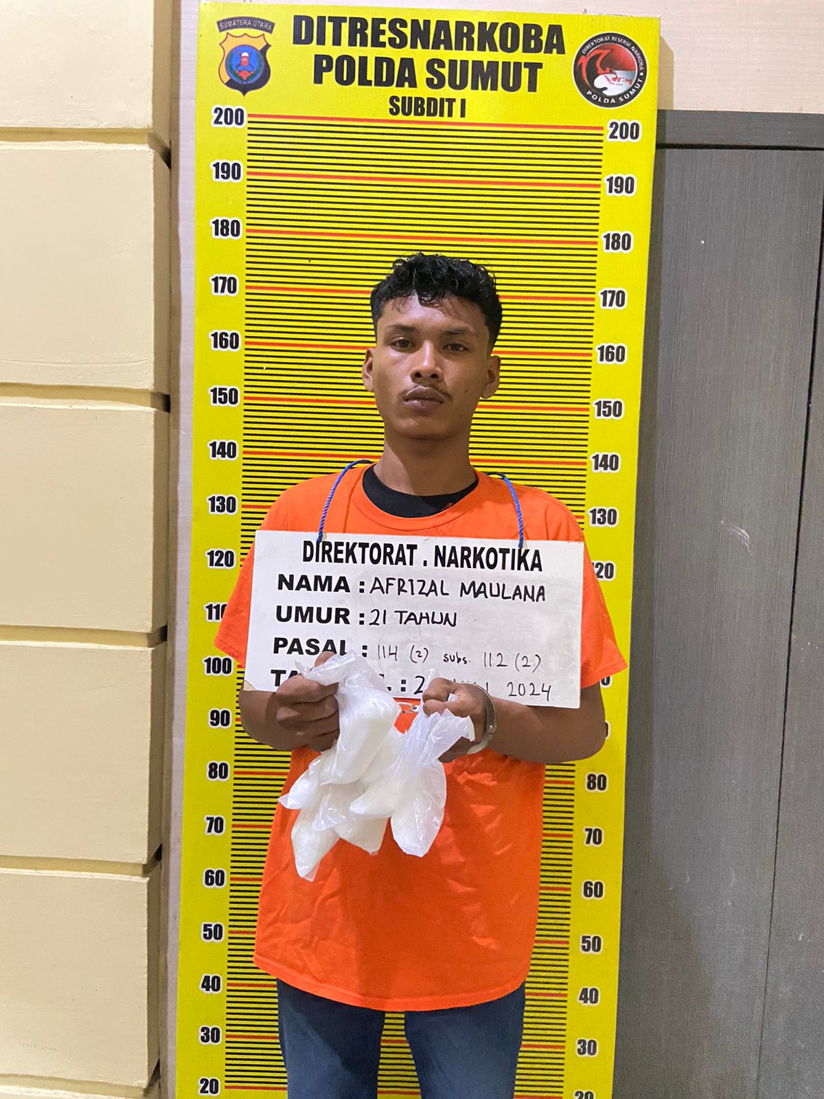 Tersangka Maulana Afrizal bersama barang bukti sabu-sabu diamankan di Mapoldasu.(ist)