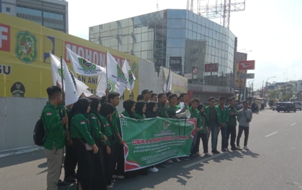 Dengan membentangkan spanduk dan bendera organiasi, Irham Sadani Rambe selaku orator dan penanggung jawab aksi mengajak seluruh masyarakat untuk mendukung pelaksanaan Pemilu 2024 yang damai, aman dan tertib.