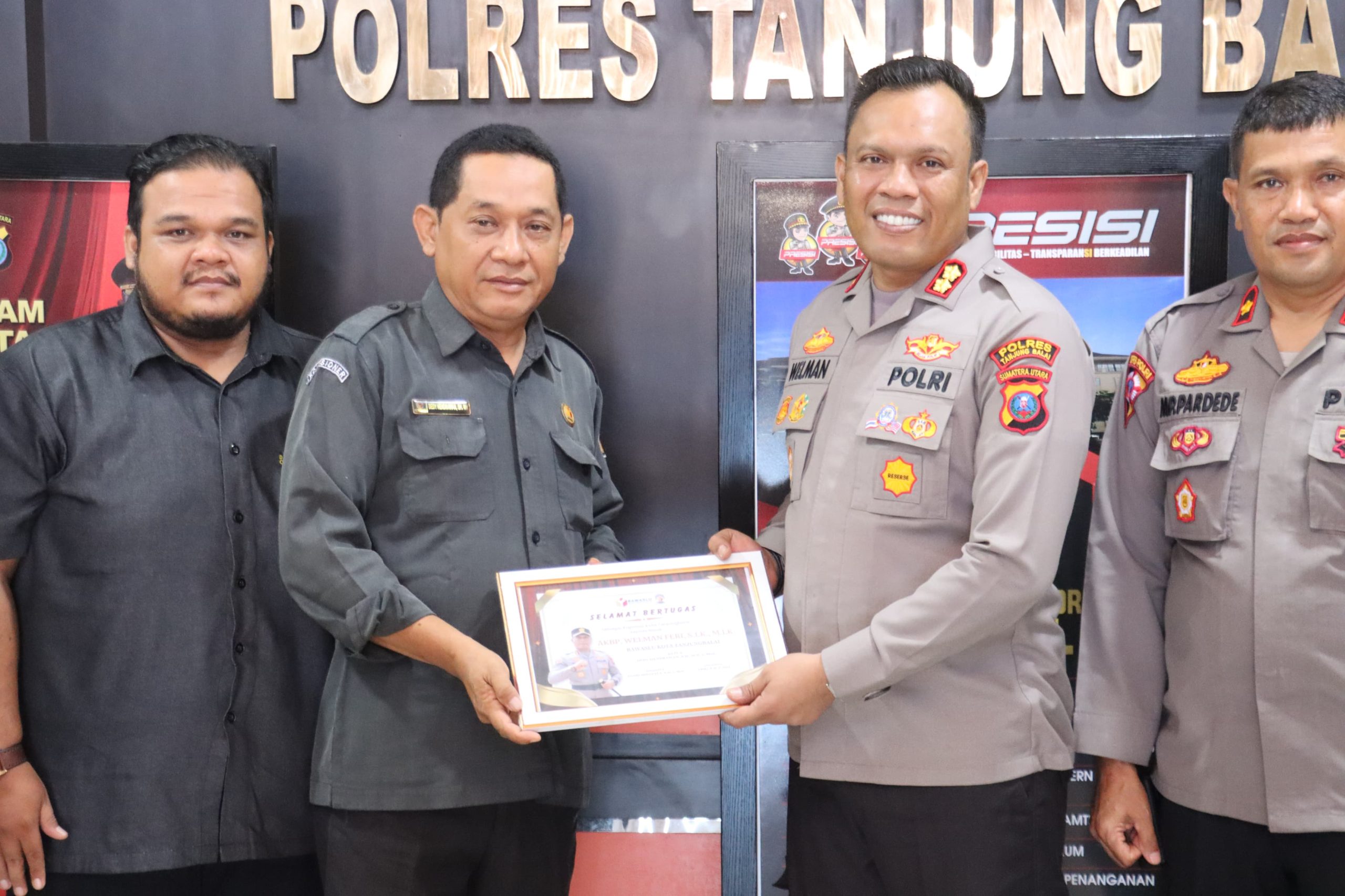 Kapolres Welman Feri SIK. MIK. beserta Ketua Bawaslu Tanjungbalai Dedi Hendrawan SH. MH. saat menerima cinderamata.(ist)