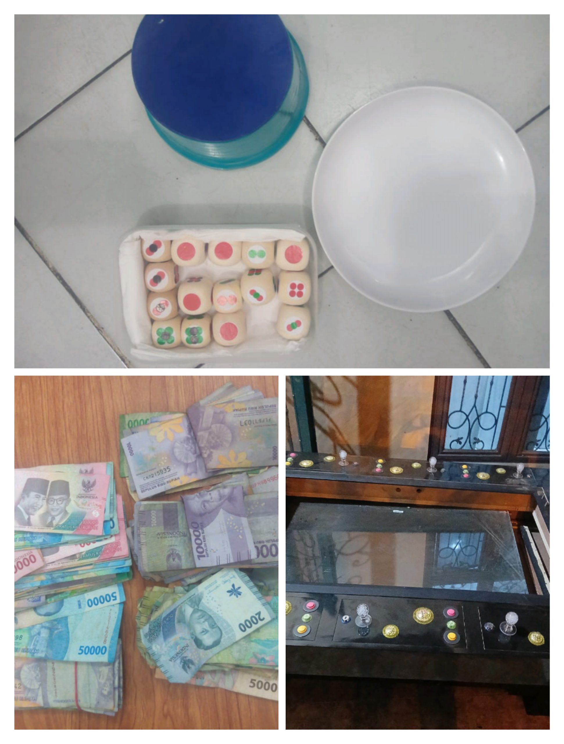– Perjudian Dadu: 4 set cadangan pasangan dadu, 1 set tempat dadu, uang tunai Rp 3.720.000, 2 terpal lapak dadu kopiyok, dan 4 unit handphone.