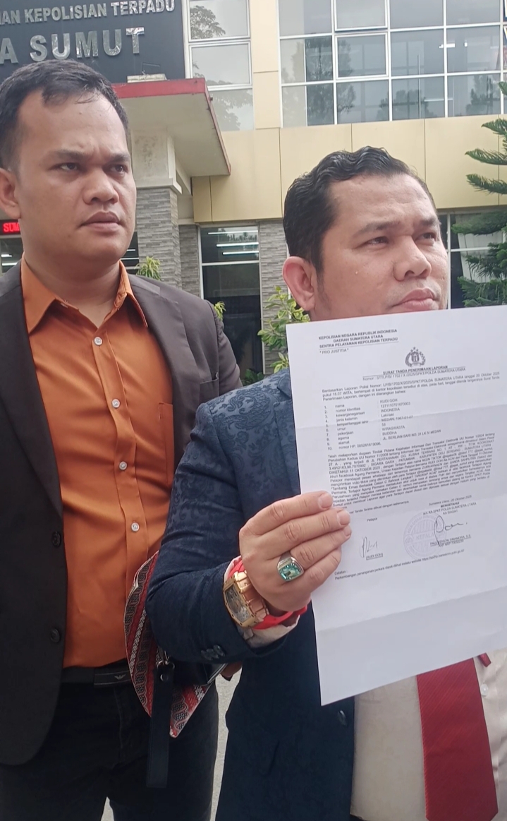 “Kita melaporkan empat akun tiktok karena sudah menjustice PT SRA penambang emas berkedok tambang galian C. Bahkan, dalam akun tiktok itu jelas disebutkan bahwa pemilik PT SRA setiap bulannya mendapat hasil 5 kilo gram emas. Artinya, ke empat akun tiktok itu telah memvonis kalau perusahaan itu jelas-jelas menambang emas,” ujar Andri Agam didampingi anggota timnya A.Silaen SH.MH di Mapoldasu, Selasa (21/10) sembari memperlihatkan Surat Penerimaan Tanda bukti laporan Nomor: STTLP/B/1702/X/2025/SPKT/Polda Sumut tanggal 20 Oktober 2025.