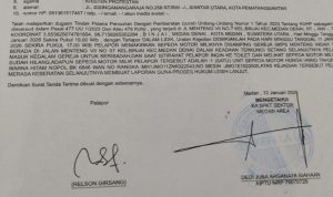 “Kita melaporkan empat akun tiktok karena sudah menjustice PT SRA penambang emas berkedok tambang galian C. Bahkan, dalam akun tiktok itu jelas disebutkan bahwa pemilik PT SRA setiap bulannya mendapat hasil 5 kilo gram emas. Artinya, ke empat akun tiktok itu telah memvonis kalau perusahaan itu jelas-jelas menambang emas,” ujar Andri Agam didampingi anggota timnya A.Silaen SH.MH di Mapoldasu, Selasa (21/10) sembari memperlihatkan Surat Penerimaan Tanda bukti laporan Nomor: STTLP/B/1702/X/2025/SPKT/Polda Sumut tanggal 20 Oktober 2025.