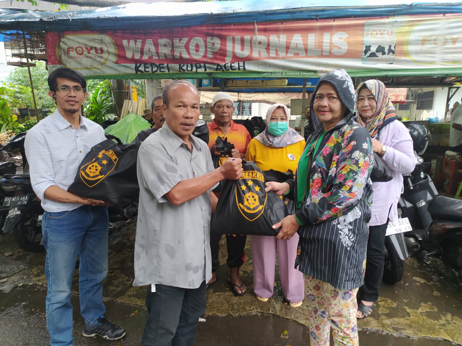 Para jurnalis menerim bantuan sembako dari Kabareskrim Polri Komjen pol.Drs.Agus Andrianto SH MH di warung Jurnalis Jl.H.Agus Salim Medan.(ist).