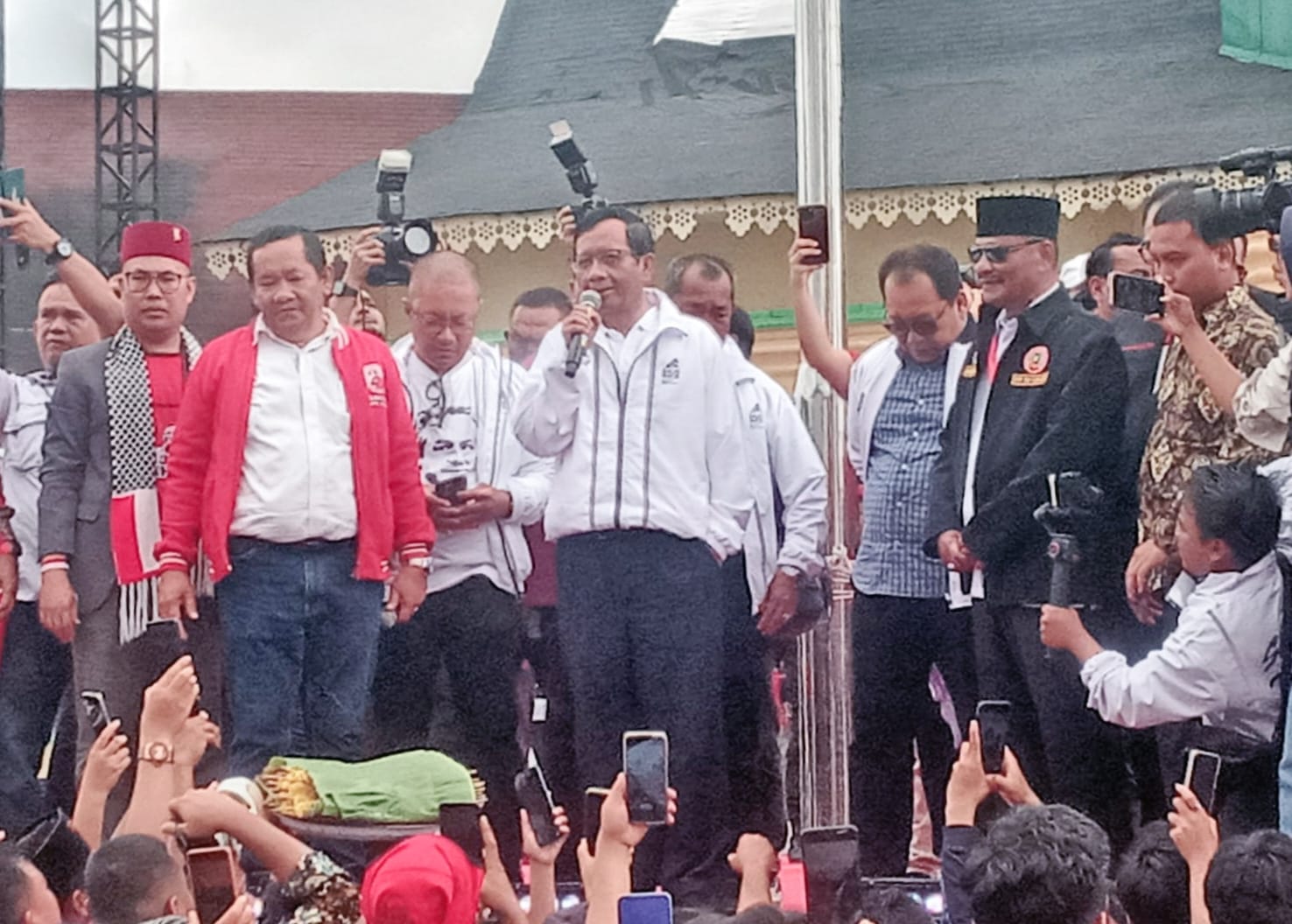 Setibanya di lapangan Astaka, Prof. Mahfud MD disambut Tim Pemenangan Daerah (TPD) Sumatera Utara Paul Baja M Siahaan, Ketua PDI-P Sumatera Utara Rapidin Simbolon, para Ketua Partai pendukung, simpatisan, masaa pendukung Capres dan Cawapres Nomor Urut 3, Ganjar-Mahfud.