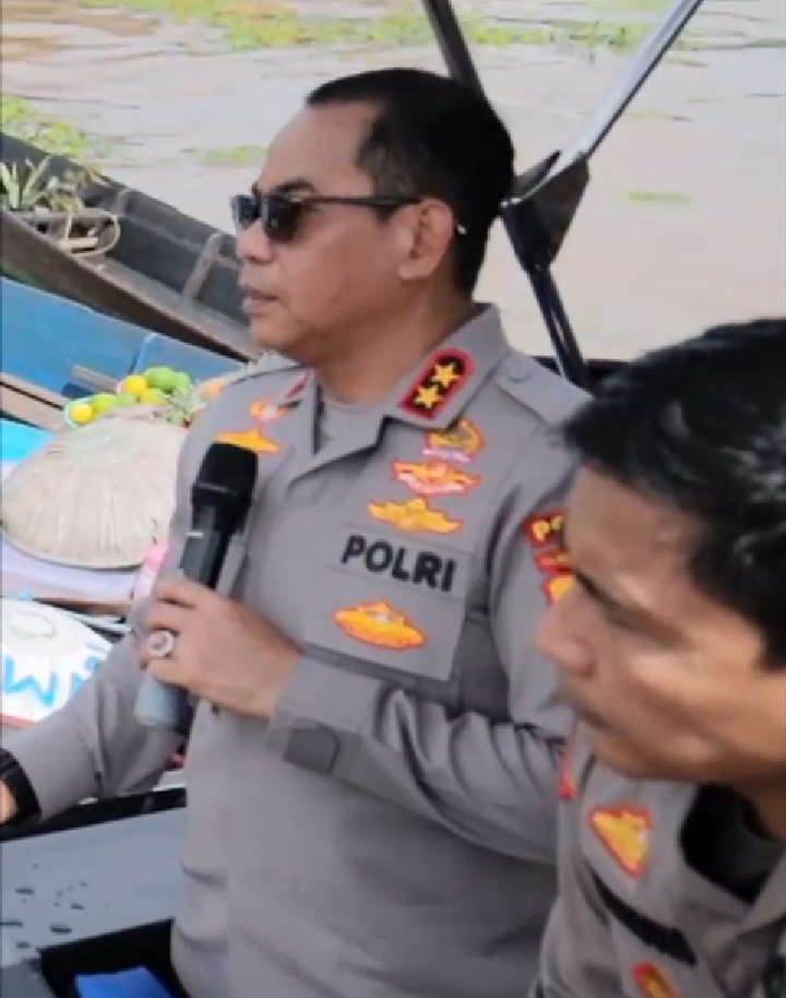 Dengan menggunakan kapal kepolisian, Kapolda Kalsel didampingi Karo Ops, Karo SDM, Dir Intelkam, Dir Polair, Kabid TIK, Kabid Humas, dan Kabid Propam Polda Kalsel, serta Kapolres Banjar, mendatangi Pasar Terapung Lok Baintan, Kabupaten Banjar, Jumat (20/1/2023).