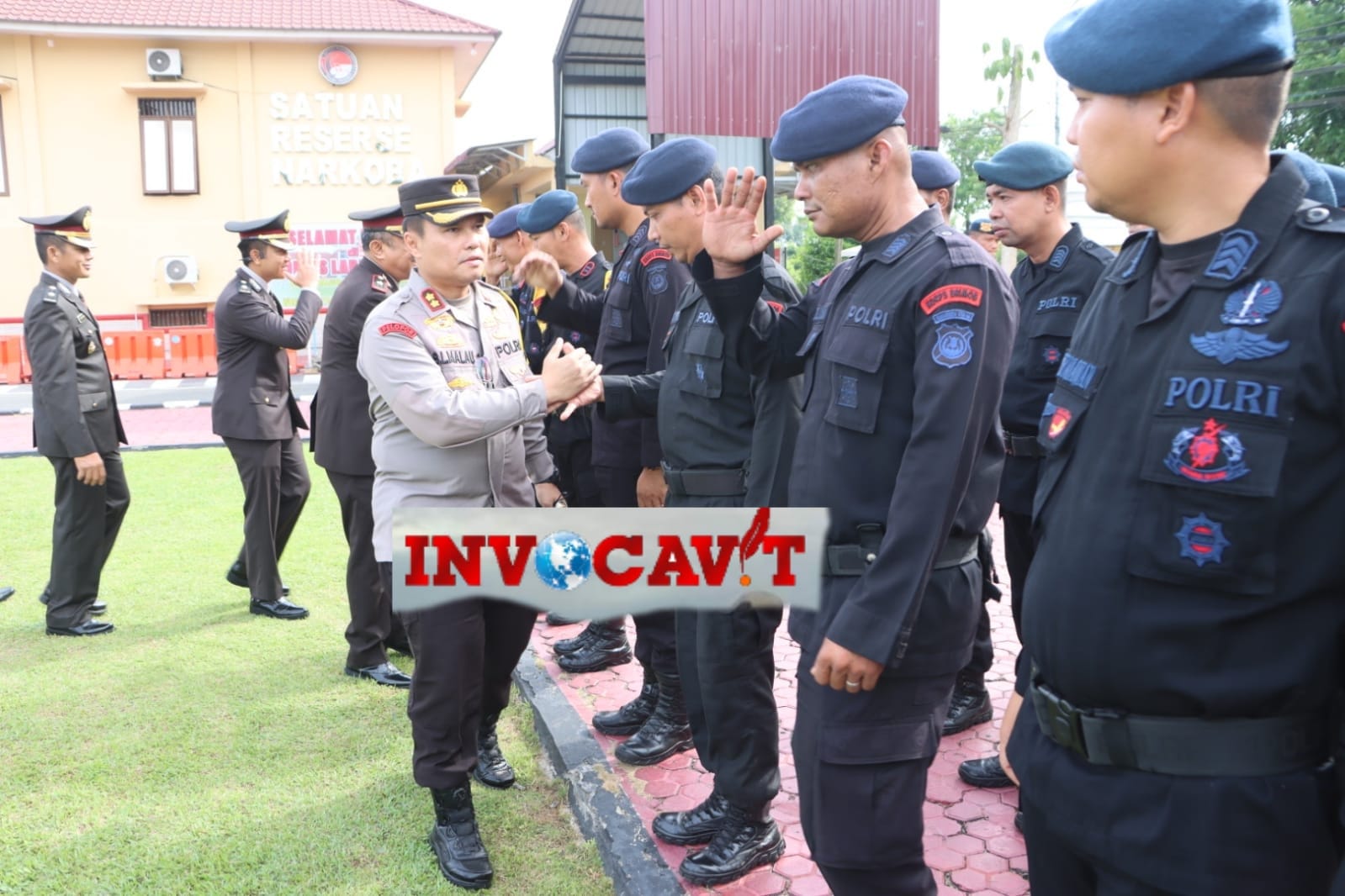 Kapolres Labuhanbatu, AKBP Dr. Bernhard L. Malau, S.I.K., M.H. bersalaman dengan personel Brimob.(abi)