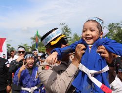 Kapolrestabes Medan Kombes Gidion Arif Setyawan menggendong anak kecil disela-sela acara Apel Potensi Kamtibmas jelang Pilkada di Taman Cadika Medan (ist).