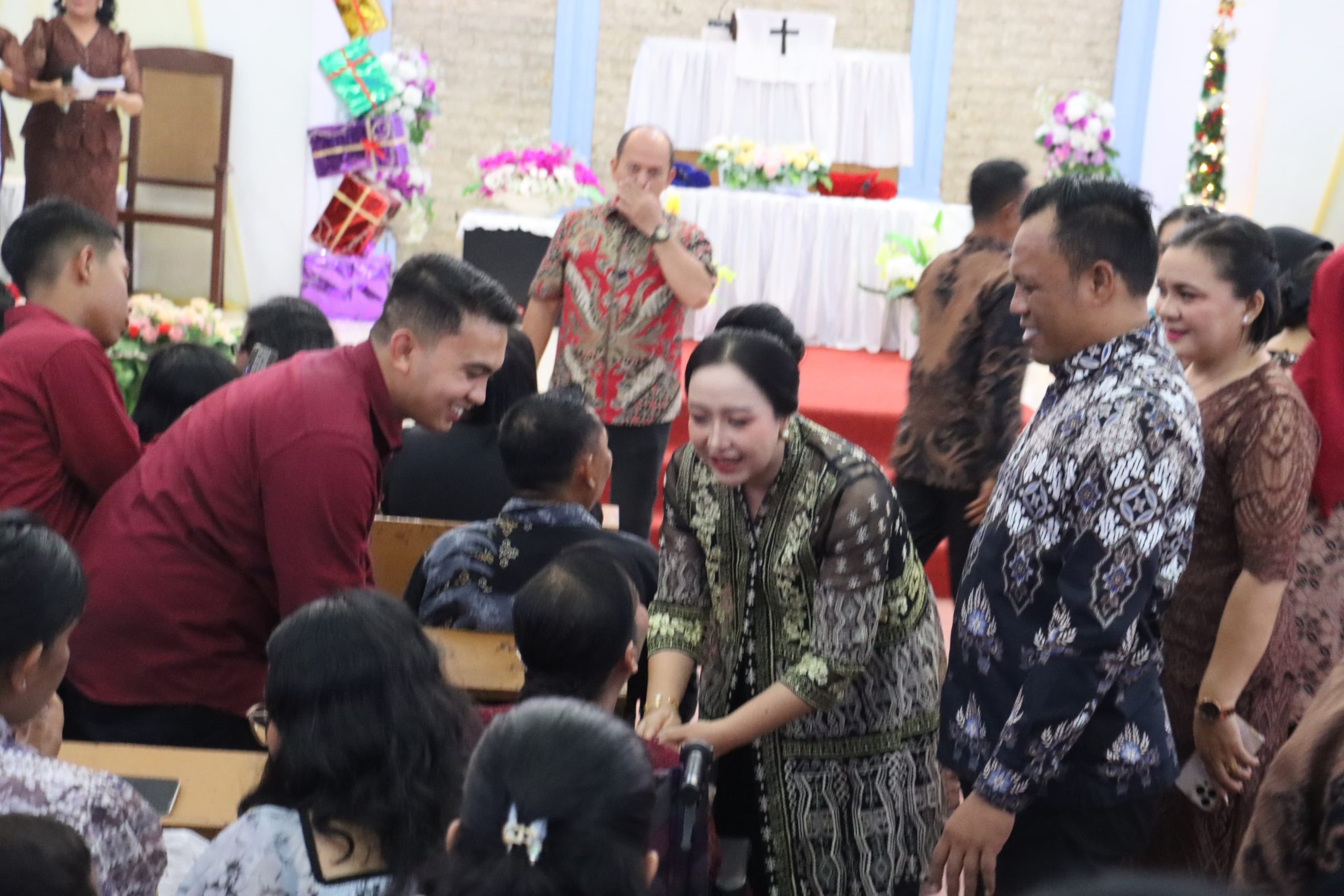 Kapolres Tanjung Balai AKBP Welman Feri bersama ketua Bhayangkari Ny Welman menyapa anggota yang merayakan Natal (ist)