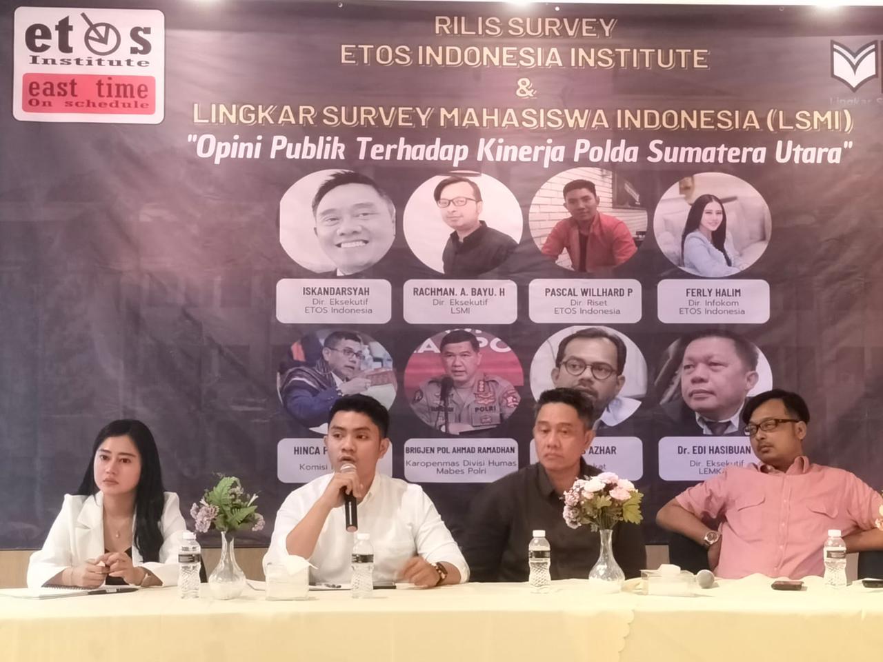 INVOCAVIT.COM, JAKARTA – Etos Indonesia Institute menyebut tingkat kepercayaan publik tentang kinerja kepolisian di wilayah hukum Polda Sumatera Utara 87 Persen. Hasilnya masyarakat puas dengan kinerja kepolisian, sementara 11 persen merasa tidak puas, dan sisanya tidak menjawab.