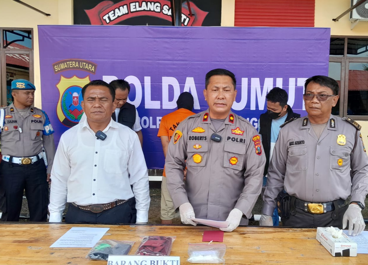 Waka Polres Tebingtinggi Kompol Asrul Robert Sembiring, didampingi, Kasat Narkoba, AKP JH Panjaitan, dan Kasi Humas AKP Agus Arianto saat Konperensi Pers, Senin (28/8/2023) menjelaskan, terkait kasus dugaan tindak pidana narkotika sebagai bandar narkoba jenis sabu-sabu yang berhasil diungkap pada Kamis (24/8/2023).
