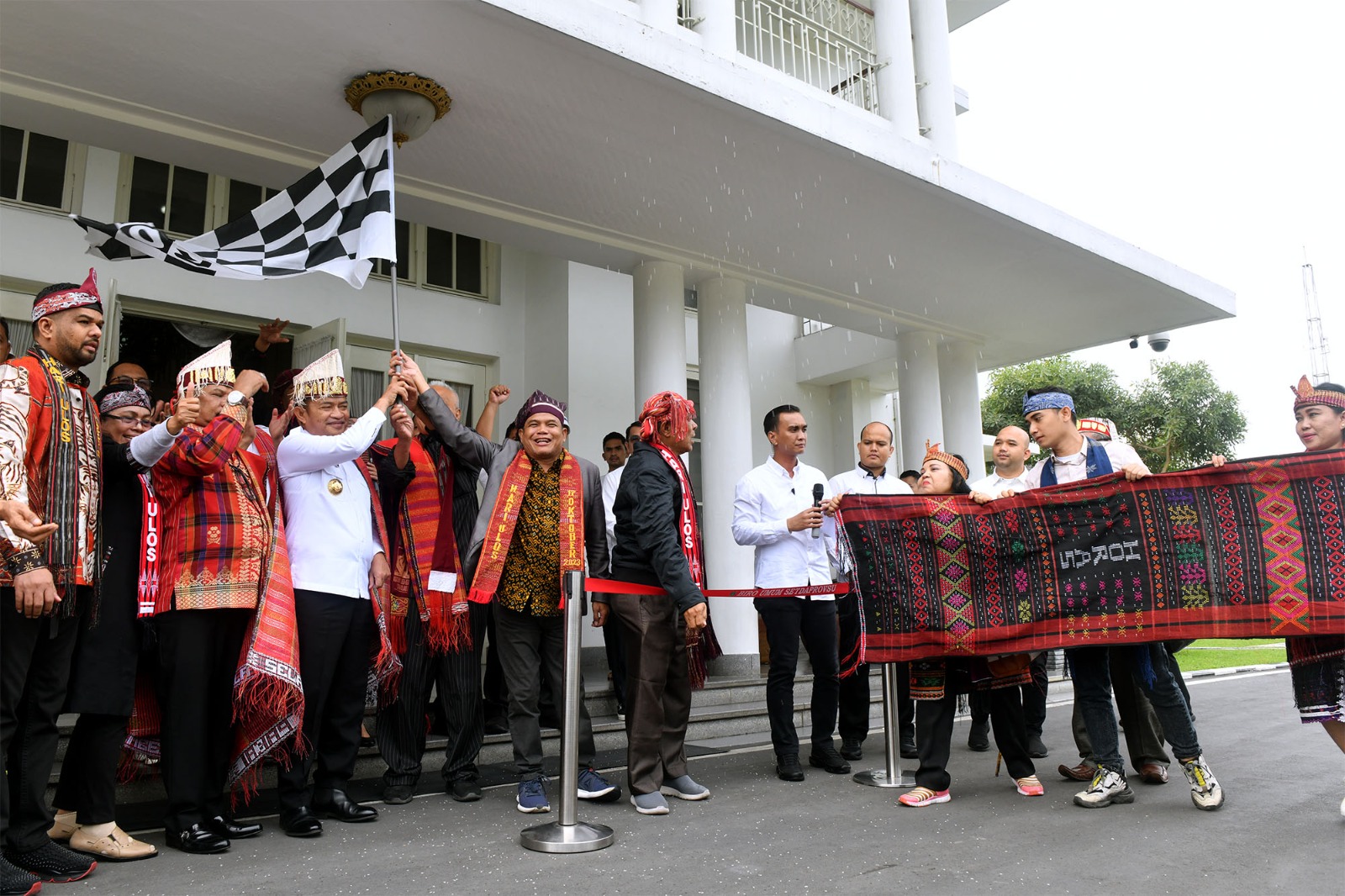 Pj Gubsu Hasanuddin lepas 1000 meter ulos ke Istana Merdeka yang akan dibawa panitia Hari Ulos Nasional.(ist)