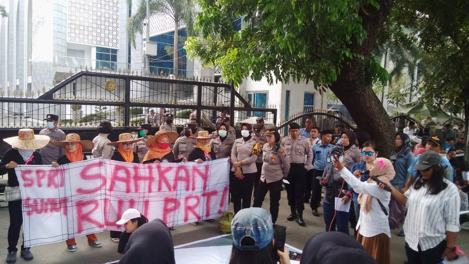 Para peserta aksi membentangkan spanduk besar bertuliskan Sahkan UU PPRT, dan sebagian lagi menggelar kain spanduk sambil memainkan aksi teatrikal, dengan mencurahkan perasaan mereka yang terzolimi.
