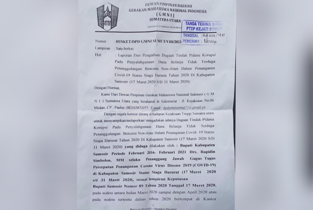 “DPP GMNI Sumut telah membuat laporan dan pengaduan terkait dugaan tindak pidana korupsi pada penyalahgunaan dana belanja tidak terduga (BTT) penanggulangan bencana non-alam dalam penanganan Covid-19 status siaga darurat Tahun 2020 di Kabupaten Samosir ke Kejati Sumut,” kata Ketua GMNI Sumut Paulus Gulo saat dikonfirmasi, Jumat (25/8/2023) siang.