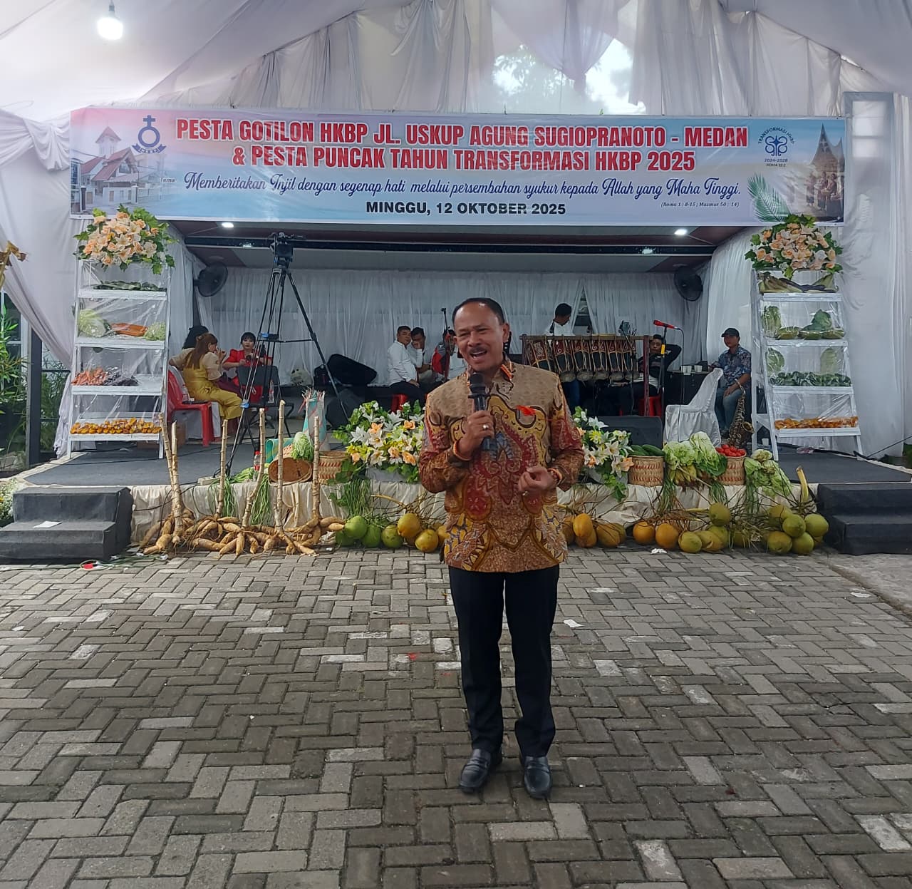 menghadiri Acara Pesta Gotilon HKBP Uskup Agung Sugiopranoto & Pesta Puncak Tahun Transformasi HKBP 2025 di Gereja HKBP Uskup Agung Sugiopranoto Jl. Uskup Agung Madras hulu, Kota Medan, Minggu (12/10).