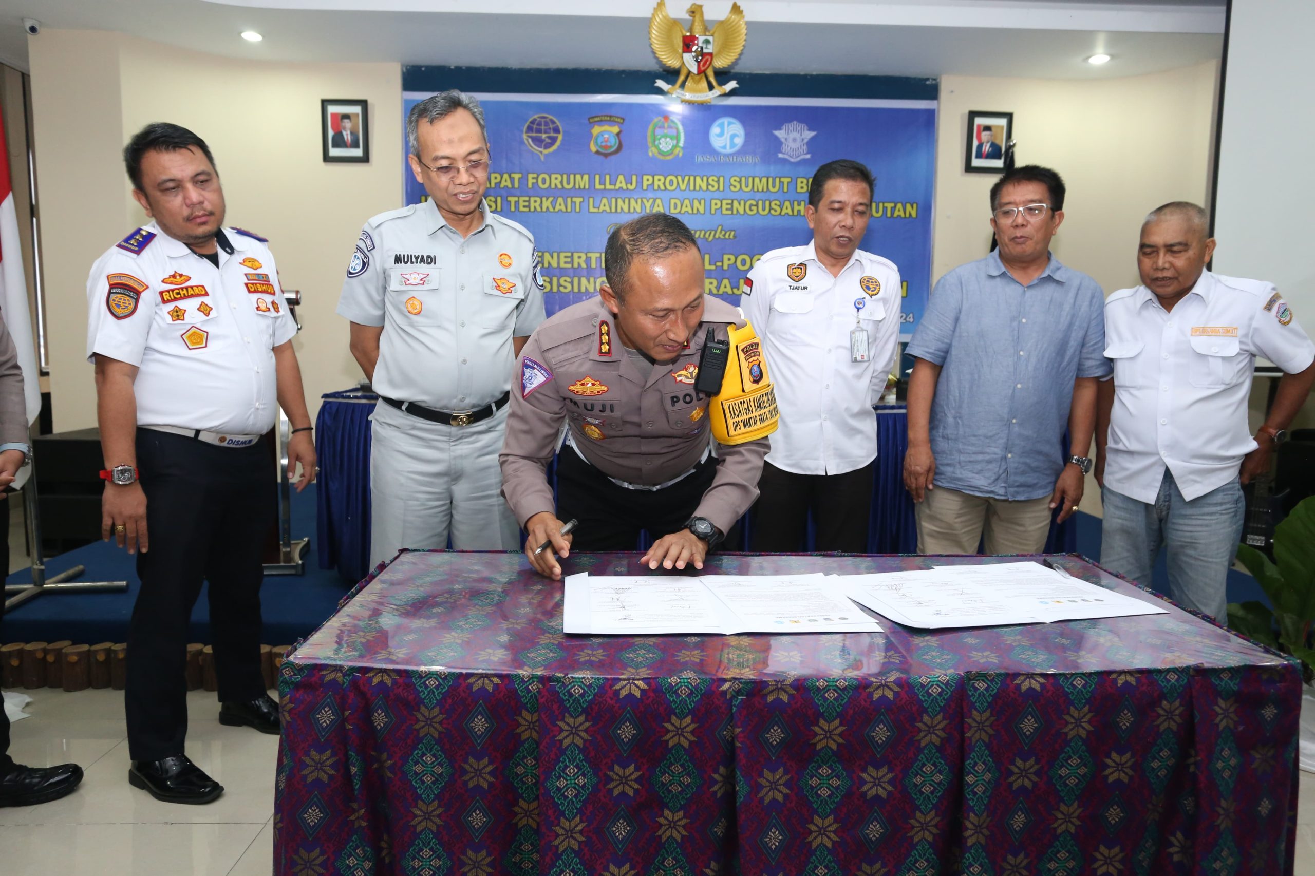 Penandatanganan kesepakatan optimalkan Terminal Amplas bagi angkutan umum oleh Dirlantas Poldasu Kombes Muji Ediyanto disaksikan pihak Dishub, Organda dan pengusaha angkutan.(ist).