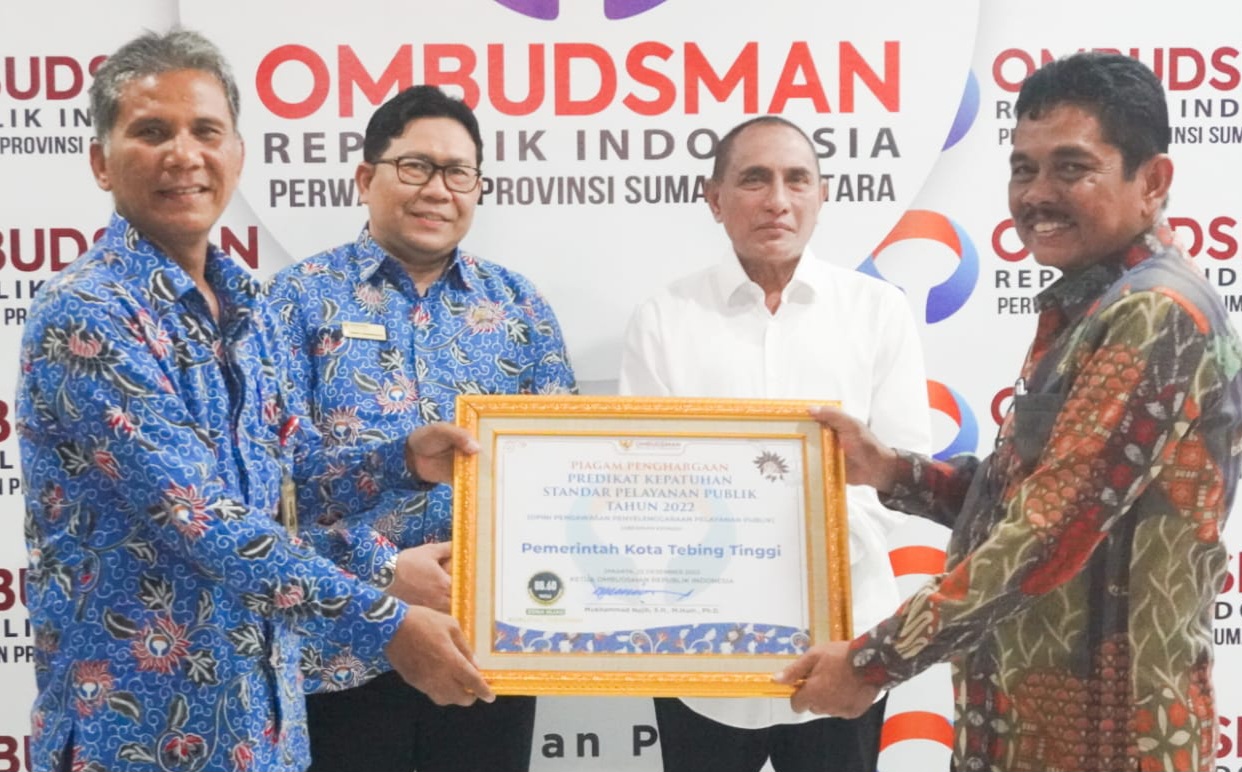 Pj Wali Kota Tebingtinggi Muhammad Dimiyathi menerima penghargaan dari perwakilan Ombudsman RI Perwakilan Sumut, peringkat 4 kategori kelas tinggi dengan nilai 88,60.(ist).