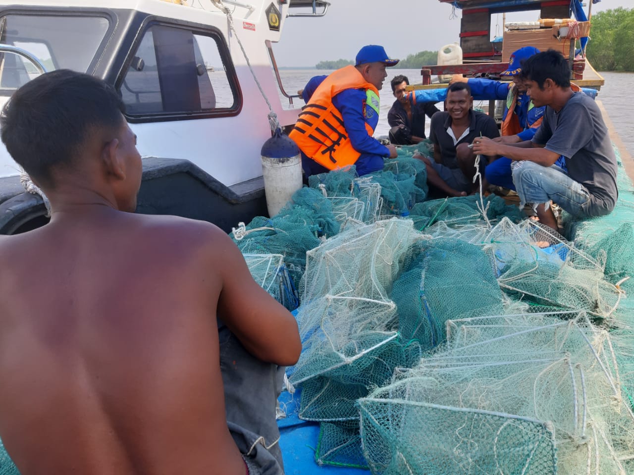 Dengan humanis duduk di Boat Nelayan Personil Polair Tanjung Balai bincang bincang serius dengan Nelayan.(Anafisham).