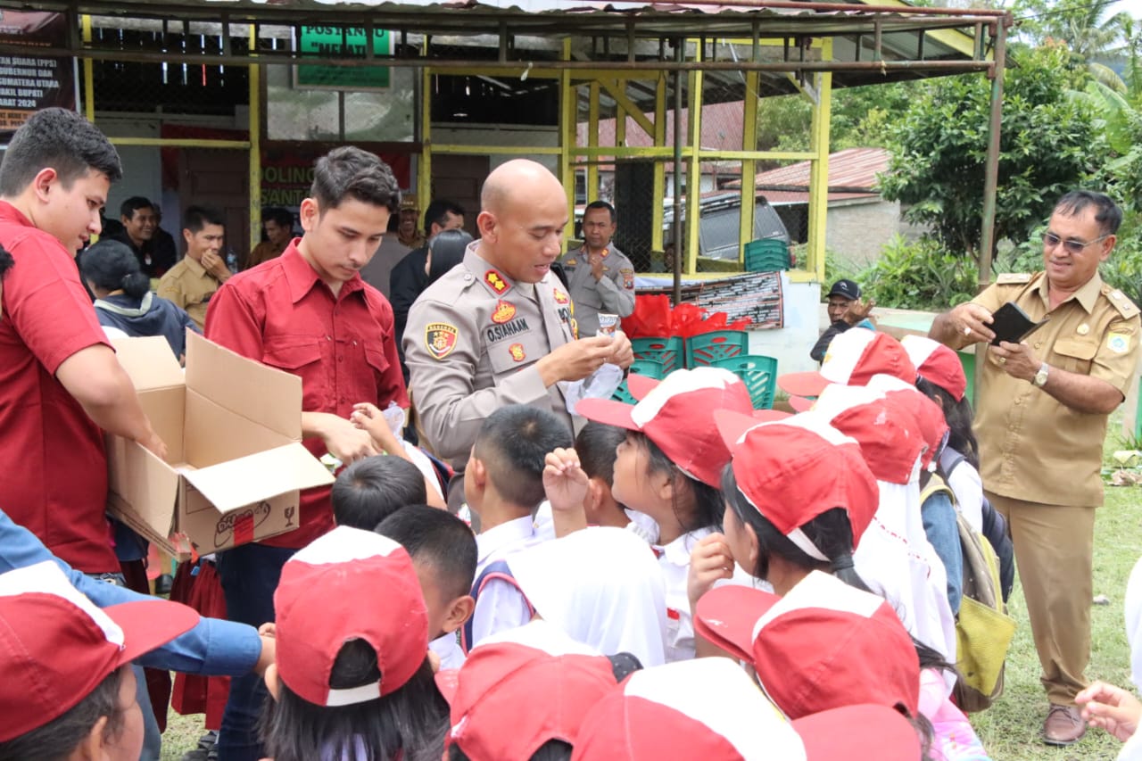 Kapolres Pakpak Bharat AKBP Oloan Siahaan membagikan jajanan kepada anak.(ist).