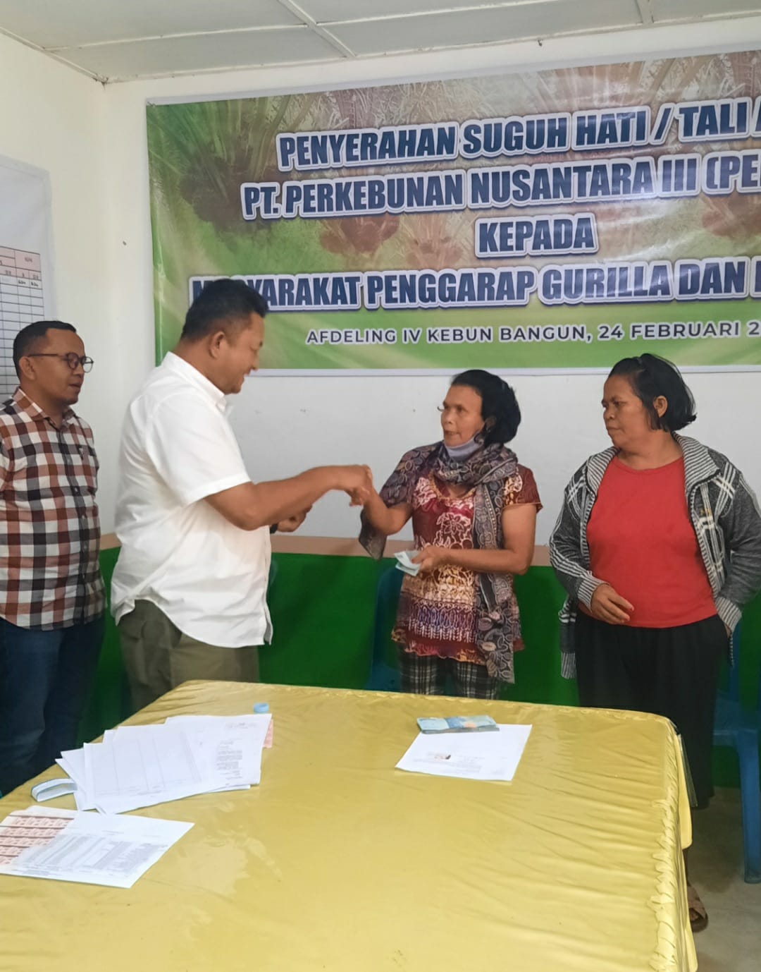 Warga yang menerima Suguh Hati di kantor PTPN III Afdeling 4, Jum’at (24/02) terdiri dari 18 warga yang selama ini bercocok tanam di lahan HGU dan dua warga yang memiliki rumah sederhana di atas areal tersebut. Mereka langsung mengembalikan areal yang dikuasai ke pihak PTPN III kebun Bangun.
