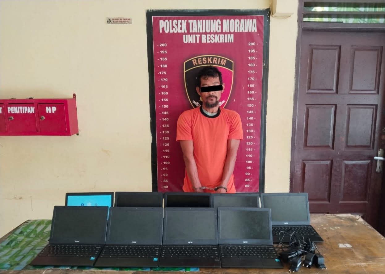 Deli Serdang, INVOCAVIT.COM: Unit Reskrim Polsek Tanjung Morawa berhasil mengungkap kasus pencurian dengan pemberatan yang terjadi di SMP Nahdlatul Ulama (NU) Kabupaten Deli Serdang. Seorang tersangka berinisial G alias Aseng (45), Warga Desa Paluh Kemiri, Kecamatan Lubuk Pakam, diamankan petugas atas dugaan mencuri 13 Unit Laptop dari Ruang Kepala Sekolah pada Rabu (08/10/2025) lalu.